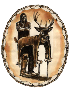 Et puis là, il s'en va fouiller dans le «campe» et en ressort avec une dépouille de chevreuil et un gros panache de huit cors, un huit «pointes». Ça fait que là, je me mets la dépouille sur le corps et puis je m'attache le panache sur la tête. C'était pas facile à faire tenir. Et puis, Jos m'avait «patenté» des béquilles courtes pour que j'aie l'air de marcher à quatre pattes.