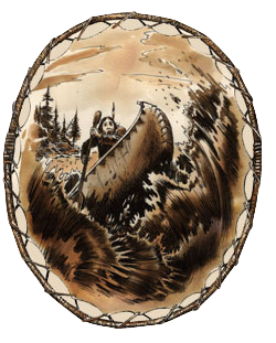 C’est là que je me suis décidé. J’ai attrapé un ballot de peaux de caribous et je suis parti en courant le long du portage jusqu’à un endroit où la rivière s’étrécit. Là, j’ai demandé à mon compagnon, Jos Testament de m’attacher le ballot bien solidement autour de la ceinture. Quand le jeune Montagnais est arrivé proche, je me suis jeté dans le courant et j’ai nagé jusqu’à lui. Je l’ai attrapé à bras-le-corps et j’ai essayé de lui tenir la tête en dehors de l’eau. Il n’y avait plus moyen de revenir au bord. Heureusement que le ballot m’aidait à flotter. Je me suis retourné vers le bas de la rivière et là, à travers les vagues et l’écume, j’ai vu comme une barre blanche brillante et puis juste derrière, une sorte de fumée d’eau qui montait dans le ciel. Les Chaudières!!! Là, j’ai nagé comme un fou pour aller vers la droite.
