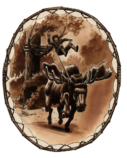 Alors je me suis accroupi et j’ai laissé pendre mon lasso. Au bout d’un moment, j’ai entendu une bête souffler presque en dessous de moi. J’ai serré la main sur ma corde et j’ai fermé les yeux. Tout à coup, j’ai senti la corde se tendre. J’ai donné un bon coup... Et c’est là que j’ai vu ce que j’avais au bout de mon lasso. C’était une énorme bête, un orignal d’au moins 1500 livres avec un panache de deux verges. Mon lasso était pris dans ses bois. Quand il a senti le lasso sur ses bois, l’orignal est parti à l’épouvante. Malheureusement pour moi, j’avais attaché cette corde autour de ma taille. Beding, bedang! J’ai été arraché de l’arbre comme si j’avais été une petite branche morte. L’orignal fonçait dans le bois droit devant lui et me traînait sans même s’en apercevoir. |