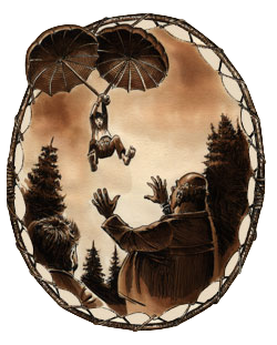 Mais comme je sautais de plus en plus haut, le parapluie s'est brisé et j'en ai été quitte pour une bonne fessée de la part de mon père. Mais cela ne m'a pas découragé. J'ai décidé de construire mon propre parapluie en me servant du parapluie brisé comme modèle. Je l'ai agrandi pour pouvoir sauter encore plus haut. Finalement, dans mon expérience la plus téméraire, j'ai attaché deux parapluies ensemble et je me suis jeté du haut d'un toit, à une vingtaine de pieds du sol, je crois. Plusieurs curieux s'étaient rassemblés pour voir le phénomène. Je me souviens même d'un bonhomme rougeaud, un peu grassouillet qui se moquait de moi : |