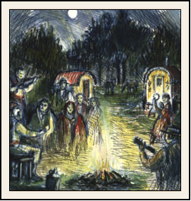 Alors que nous nous étions arrêtés pour permettre à Janda de reprendre son souffle et de refaire ses forces, nous entendîmes des voix qui semblaient venir du faîte de l'escarpement bordant la berge. Je proposai à Janda de m'attendre pendant que je grimperais là-haut pour voir ce qui s'y passait. J'escaladai la pente abrupte et rocailleuse avec mille précautions, me dirigeant sur les voix qui me parvenaient de plus en plus distinctement. Je fus bientôt en vue d'un campement de roulottes faisant cercle autour d'un grand feu qui crépitait de toutes ses braises. Piqué par la curiosité, je m'approchai encore un peu... |