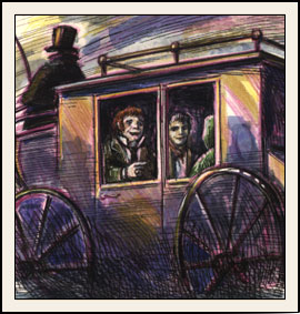 Nous n'étions plus qu'à une trentaine de lieues de Gdansk, nous avaient informés nos amis du campement, et nous comptions bien y parvenir le plus vite possible. Janda avait repris des forces et recommençait son gai bavardage qui rendait nos pas plus légers. De temps à autre, une voiture tirée par des chevaux nous dépassait et nous devançait de très loin. Janda eut alors l'idée de demander au conducteur de l'une de ces voitures de nous faire monter. Nos premiers essais se révélèrent infructueux. Plus souvent qu'autrement, les conducteurs répondaient à nos signes en nous faisant la nique et en nous lançant des quolibets. |
